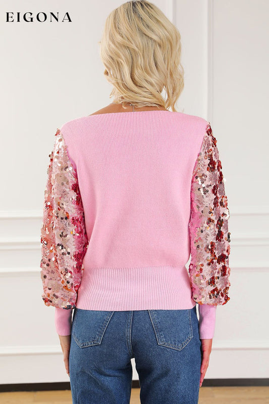 Maglione lavorato a coste con scollo a V e maniche con paillettes rosa a contrasto