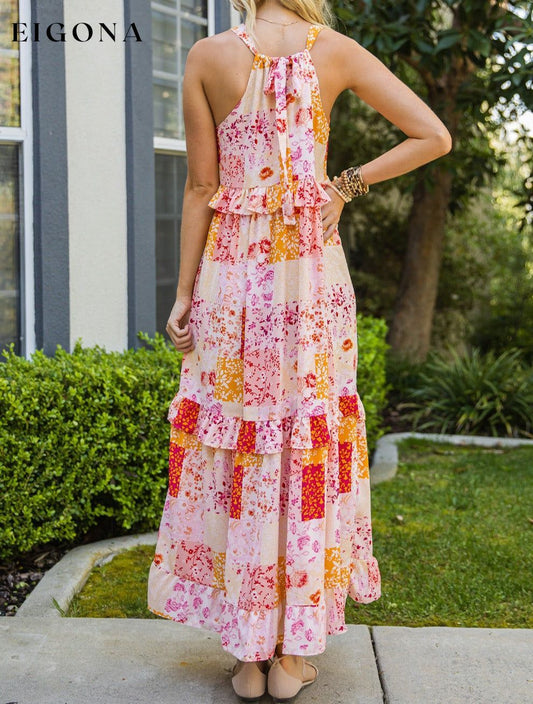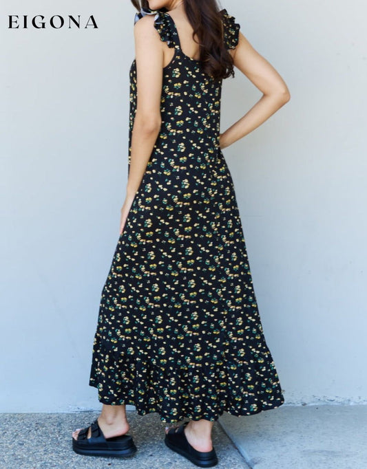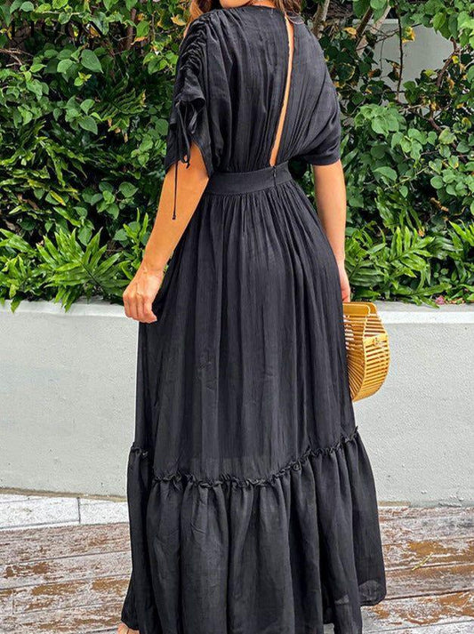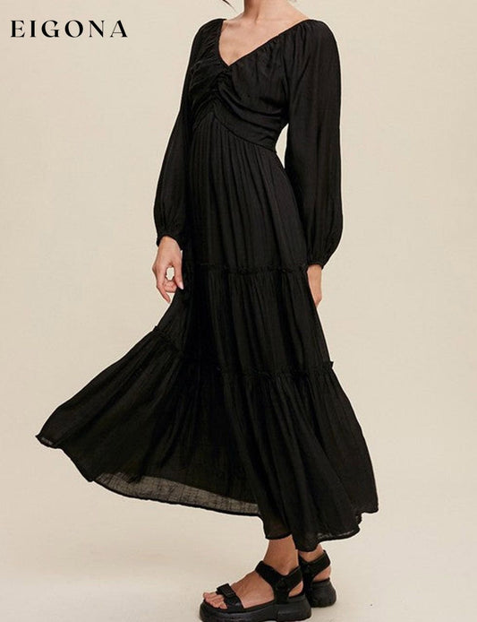 Abito lungo a strati con volant e scollo a V nero con fiocco e scollo a V