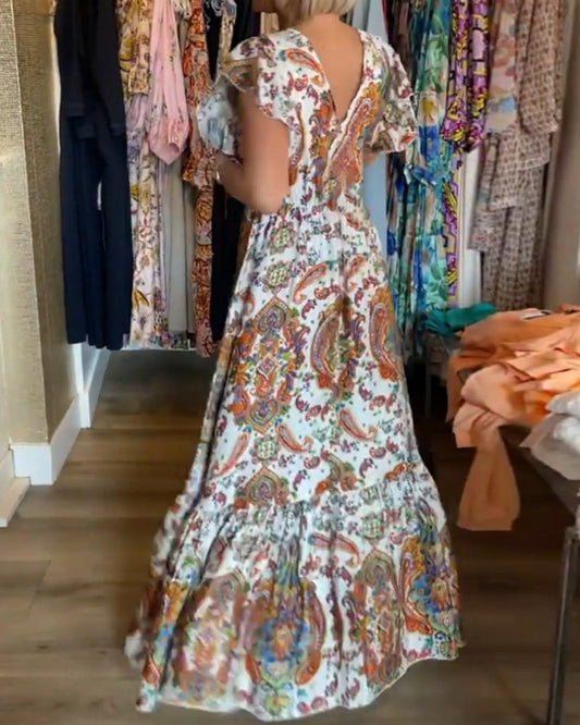 Abito elegante stampato con maniche a campana e spacco con bottoni