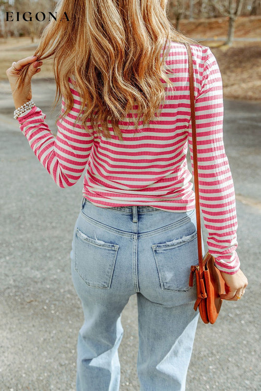 T-shirt con spacco a maniche lunghe a righe con scollo tondo