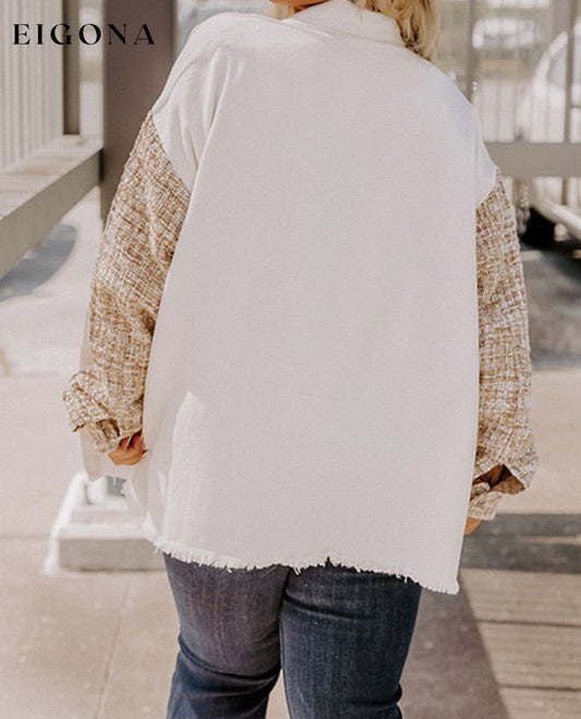 Giacca camicia abbottonata a maniche lunghe con patchwork in tweed bianco taglie forti con orlo grezzo