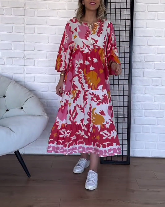 Boho-trykt kjole med ballongermer med snøring