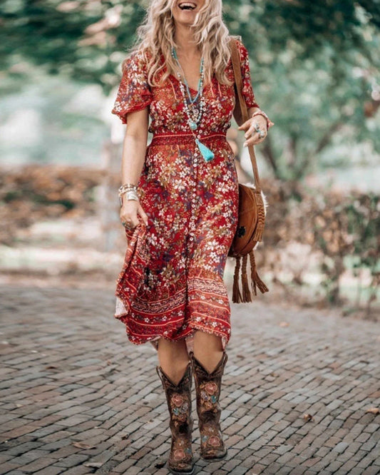 Boho-trykt kortermet splittkjole