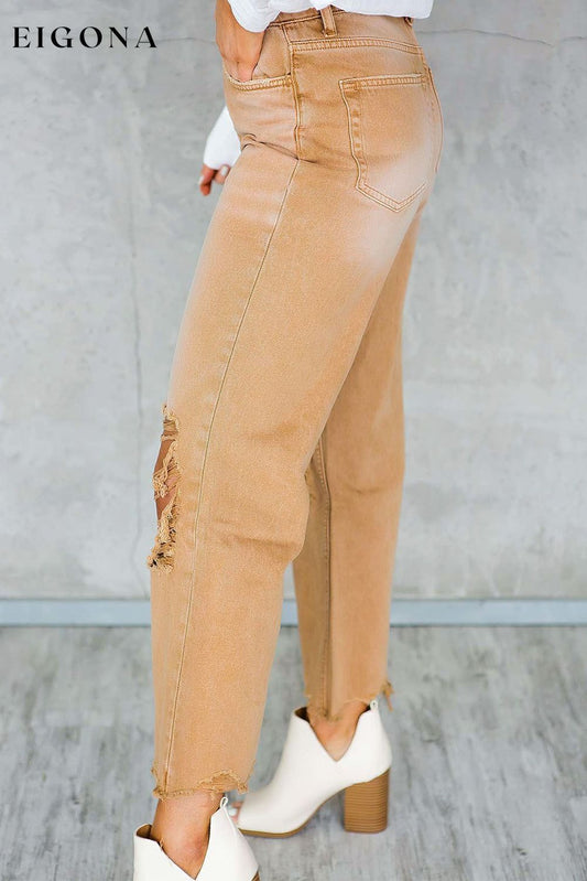 Brown Distressed Hollow-out High Waist Cropped Flare Jeans