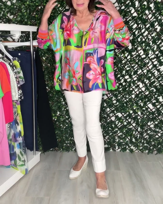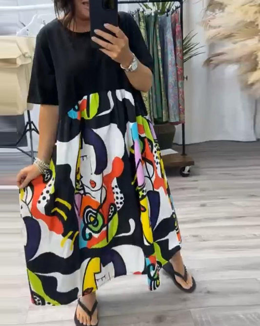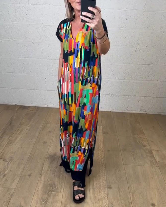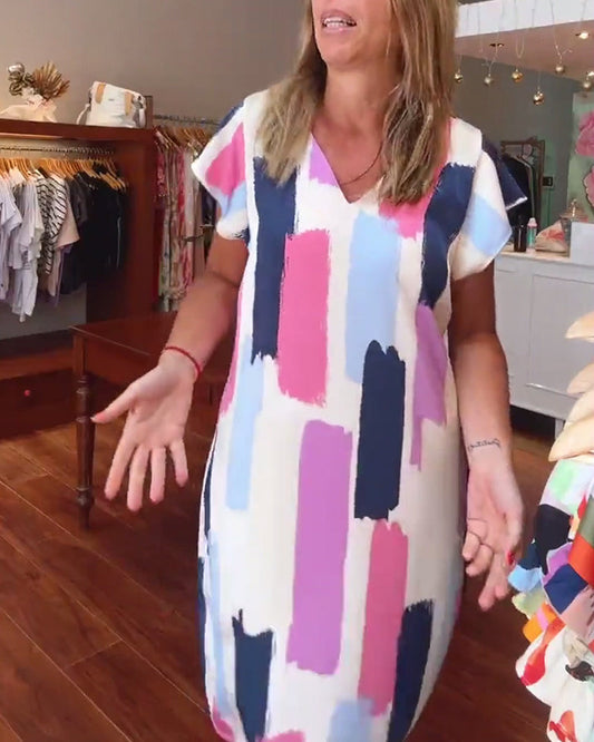 Uformelt fargerikt trykt V-hals trekvart ermet kjole