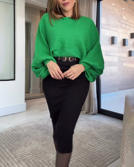 Ensfarget ribbestrikket genser med lanterneermer