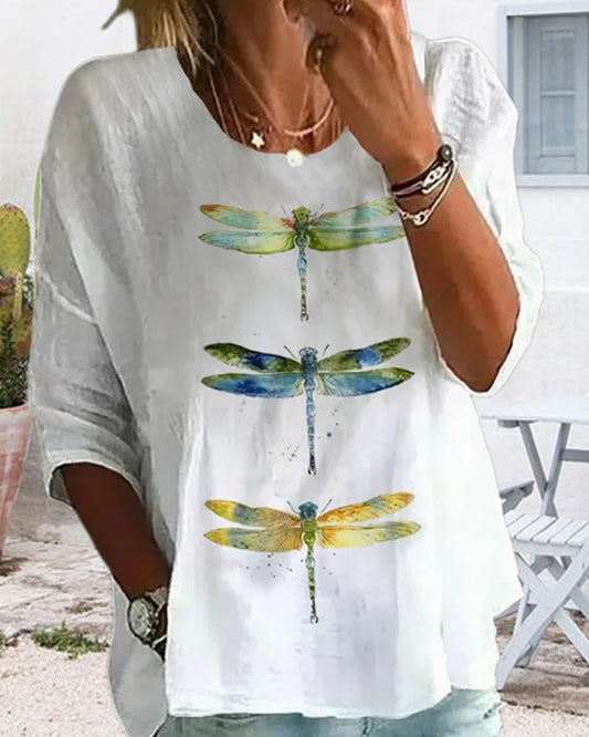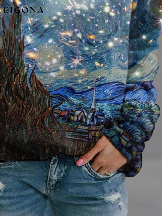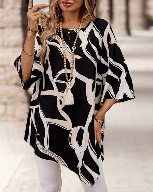 Casual T-skjorte med rund hals, oljemaling og rombildetrykk