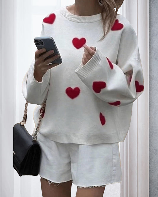 Casual Crew Neck Heart Pattern Pullover Sweater
