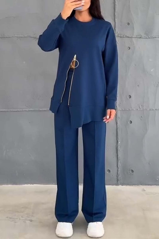 Kvinners uformelle ensfargede rundhals lange ermer splitt hem Sweatshirt Leggings sett
