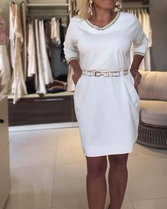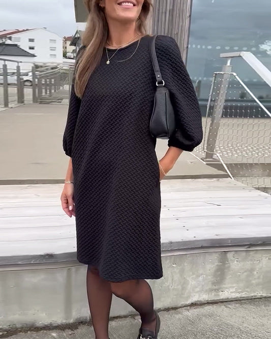 Mote ensfarget kjole med rund hals og hofteviklet langermet