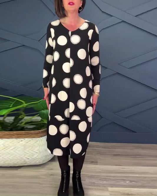 Elegant langermet kjole med rund hals med geometrisk trykk