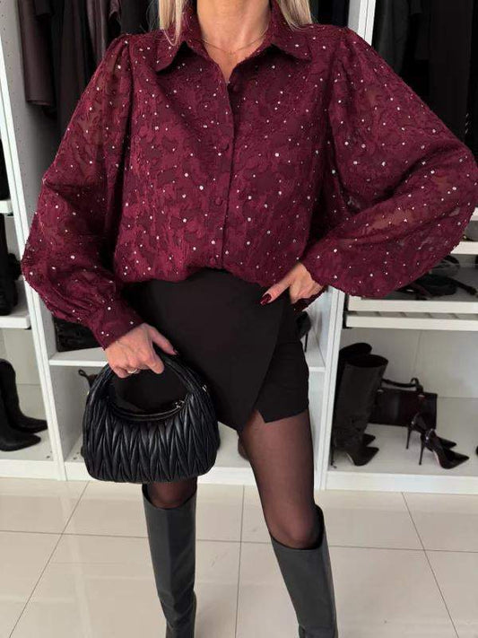 Ladies Lapel Long Sleeve Hot Diamond Casual Shirt