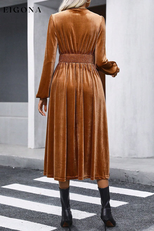 Camel Wrap V-hals smocked høy midje langermet fløyel midi kjole