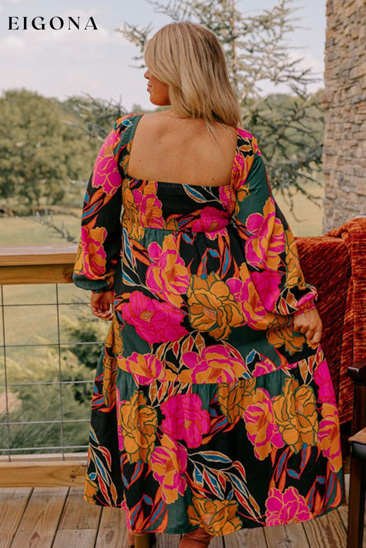 Flerfarget blomstertrykk firkantet hals høy midje pluss størrelse kjole