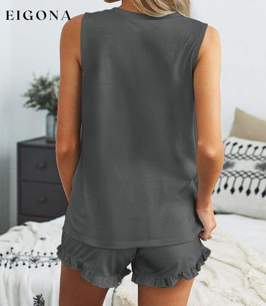 Mørkegrå tank med rund hals og snøring med volanger. Loungesett