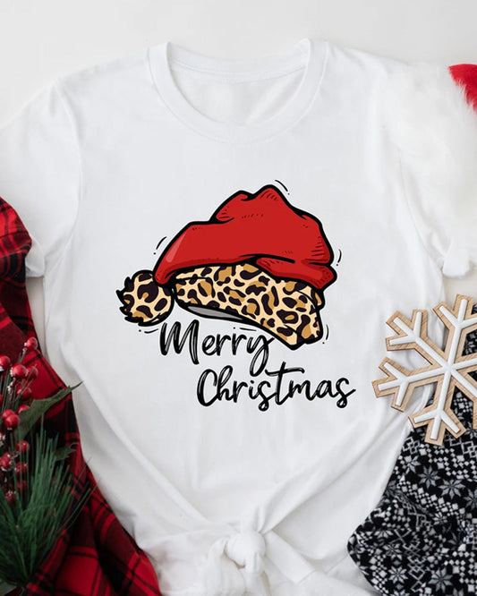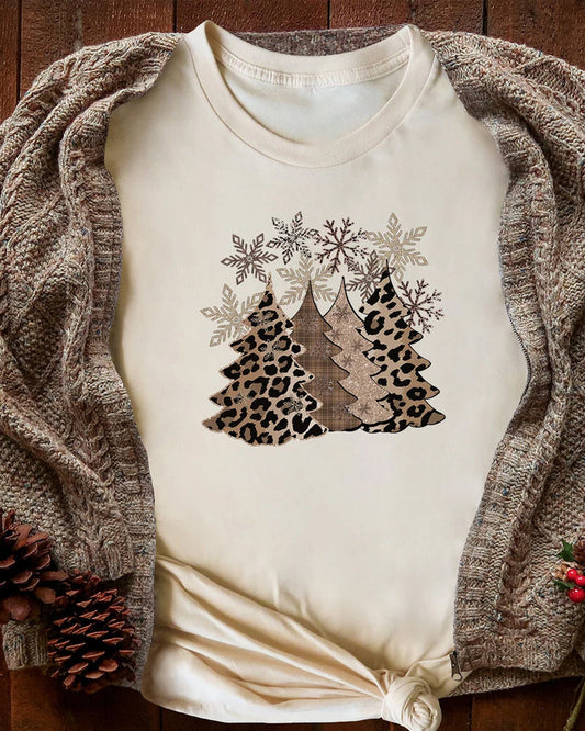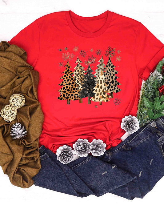 Christmas tree leopard snowflake print round neck short sleeve t-shirt