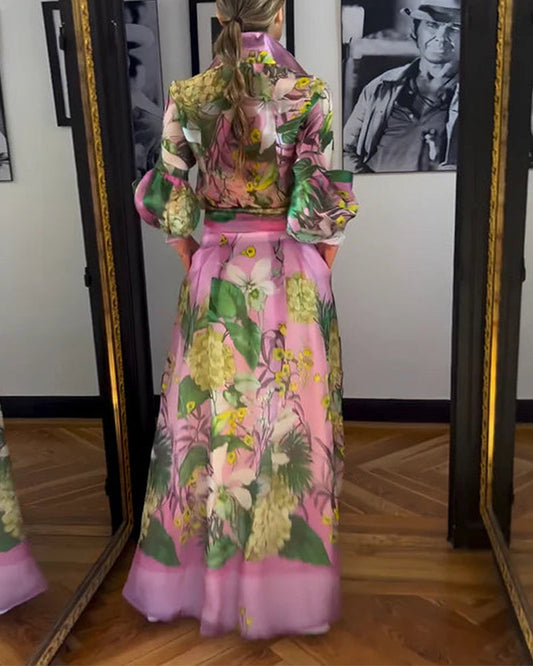 Stilig maxikjole med jakkeslag og blomstertrykk med lomme
