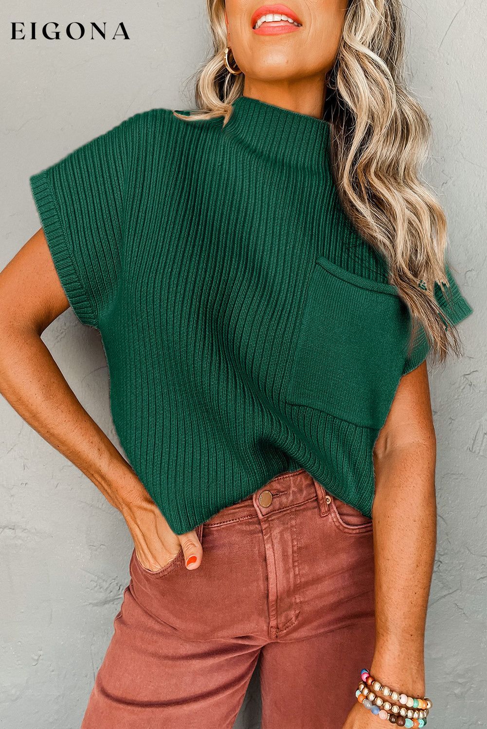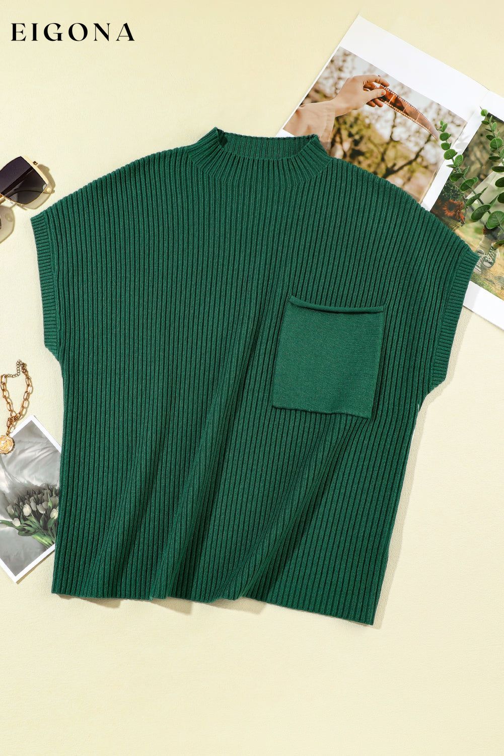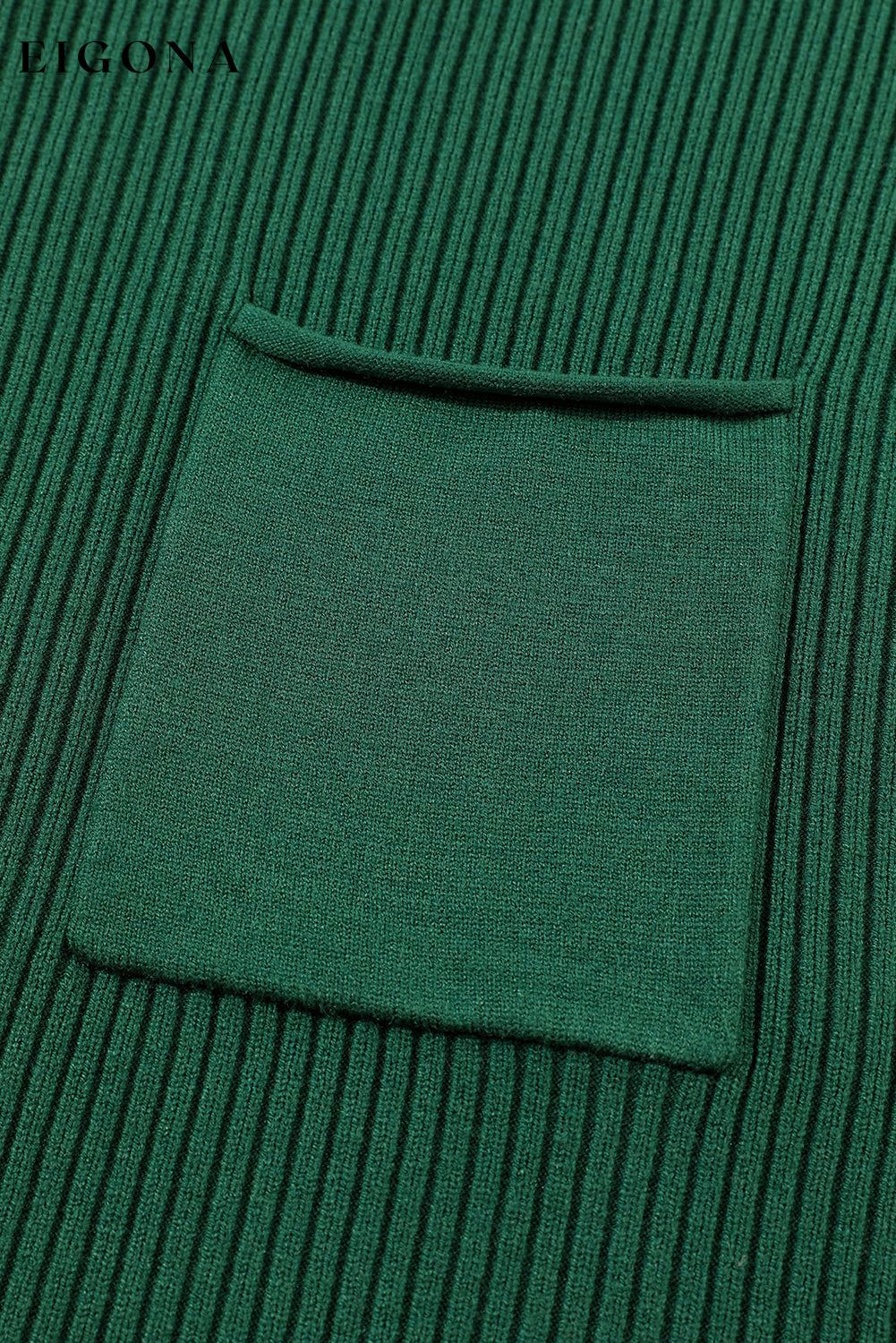 Blackish Green Patch Pocket Ribbed Knit Short Sleeve Sweater
