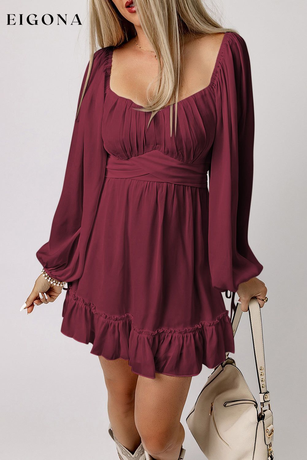 Fiery Red Plain Ruffled High Waist Square Neck Mini Dress