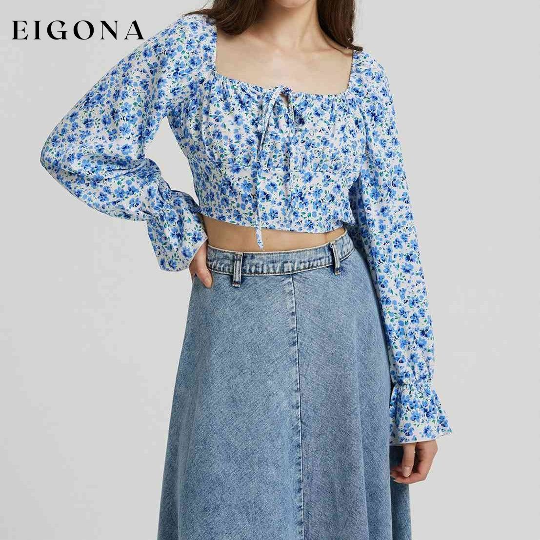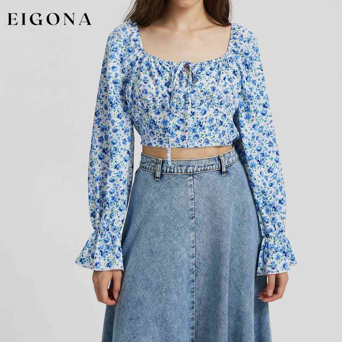 Floral Tie Front Square Neck Flounce Sleeve Blouse