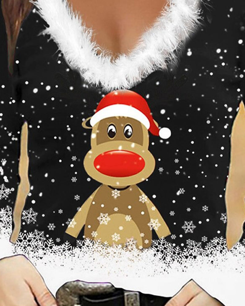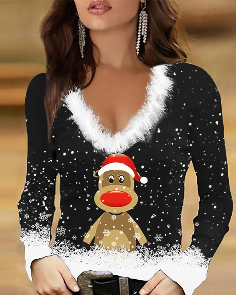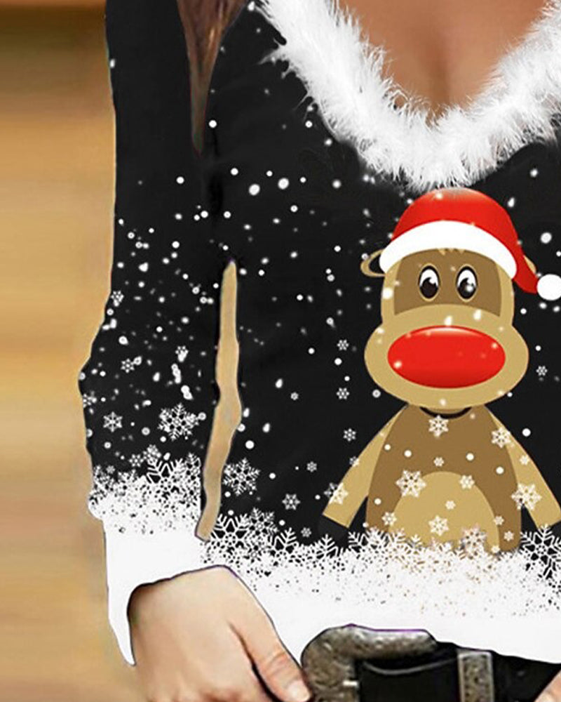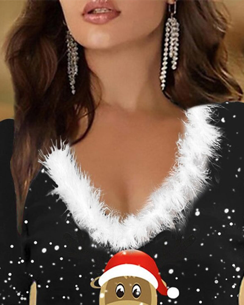 Fur Collar Slim-Fit Printed Top