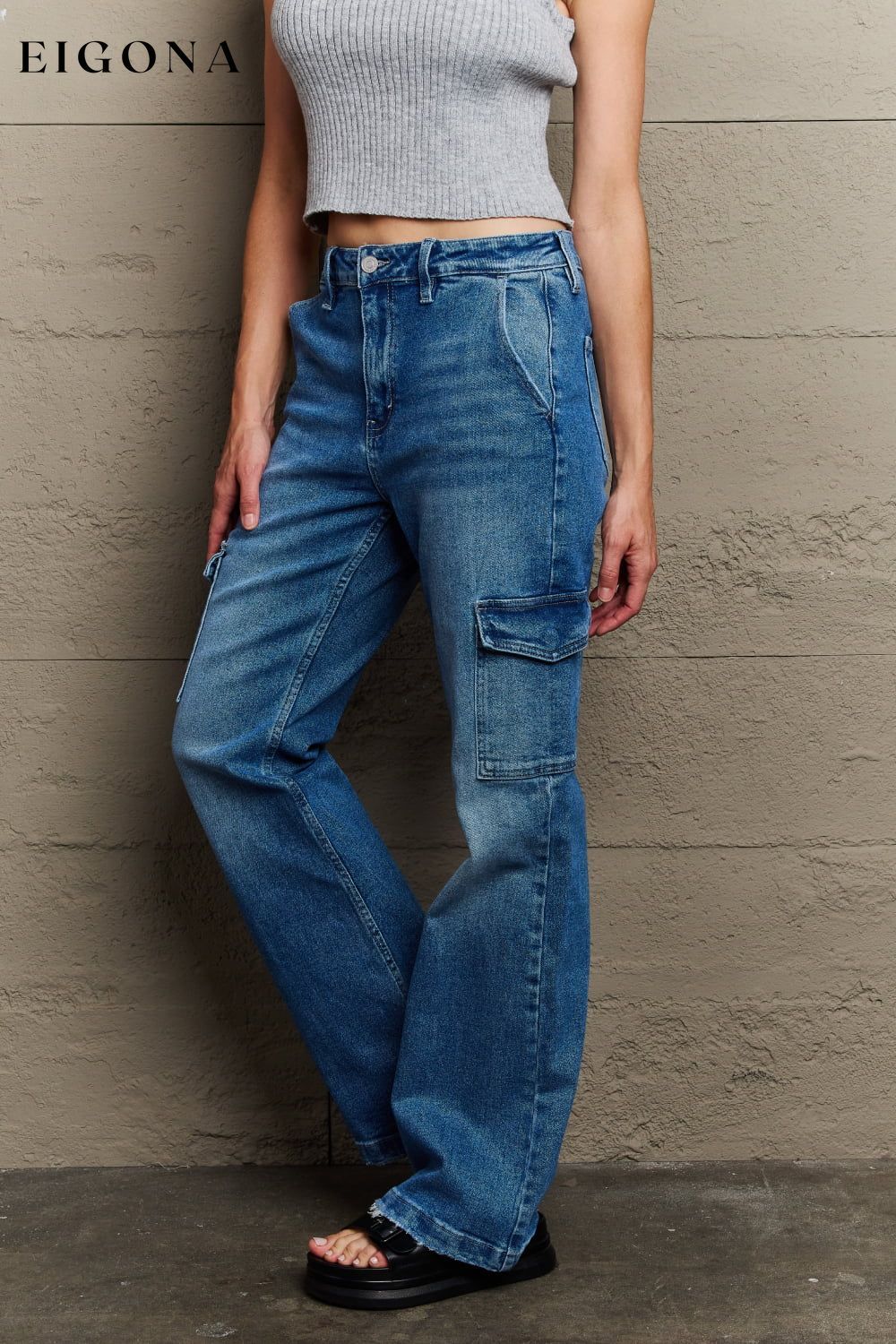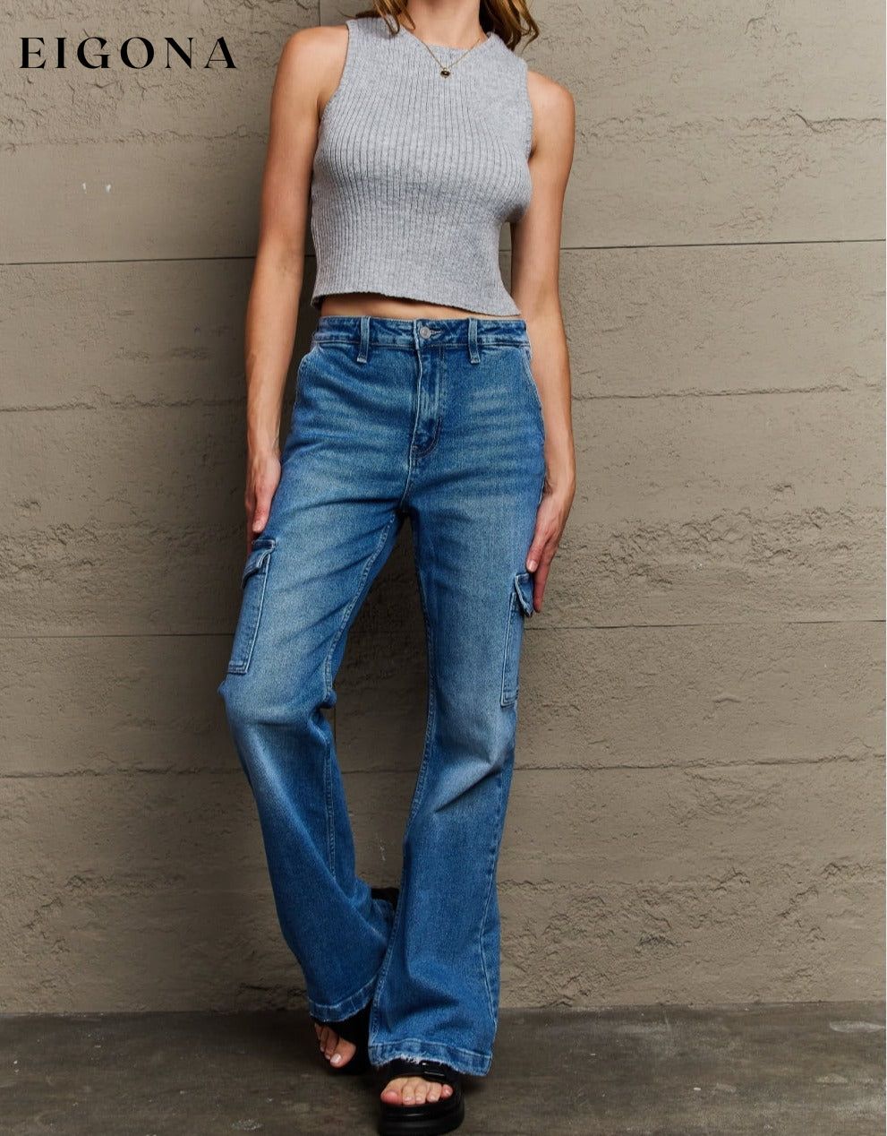 These jeans feature a comfortable stretch that ensures a flattering fit all day long. The high rise design offers a trendy and versatile look, while the zip fly adds convenience. Complete with slanted front pockets and cargo detailing, these jeans are not only fashionable but also practical, providing ample space for your essentials. Upgrade your denim collection with these cargo flare jeans that effortlessly combine fashion and functionality.