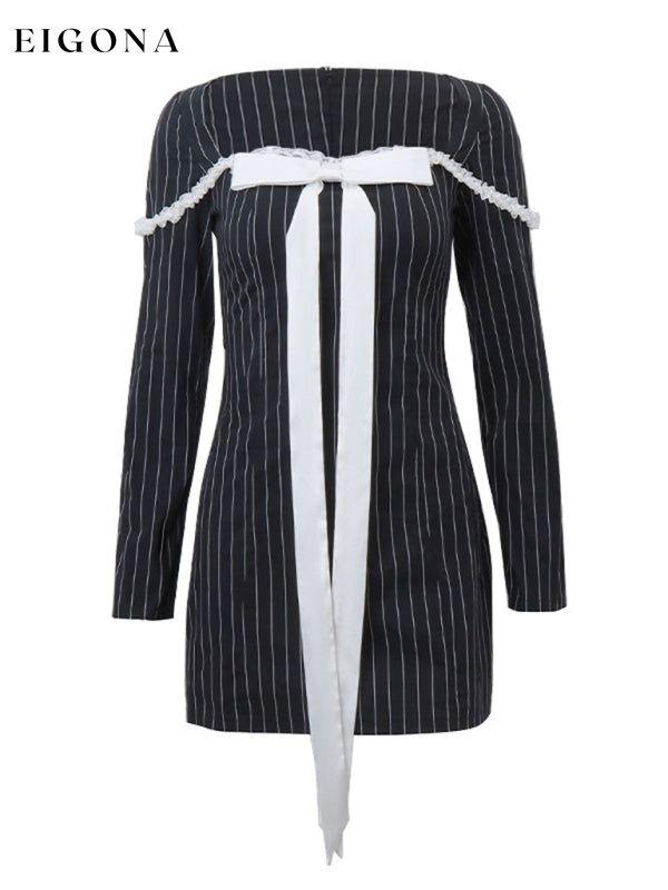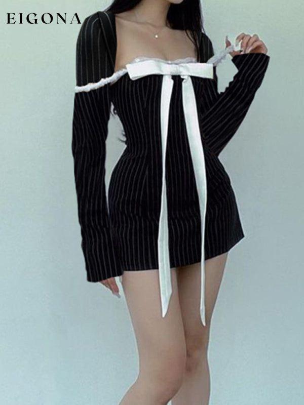 New style French square neck bow tie temperament striped long-sleeved Sexy Mini dress