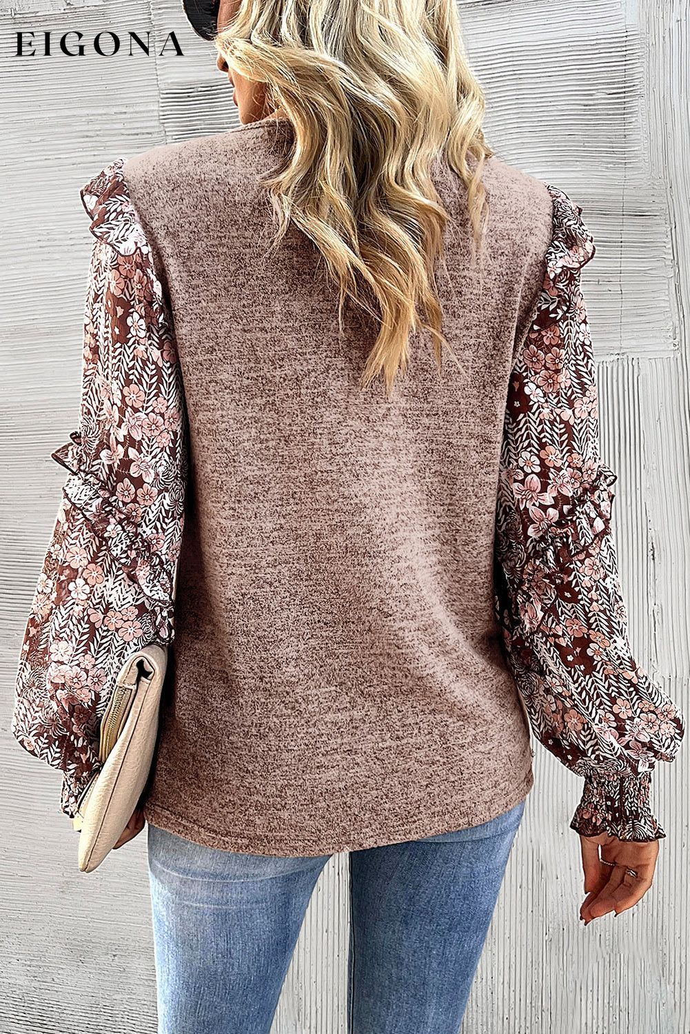 Pale Chestnut Ruffle Tiered Floral Sleeve Crew Neck Blouse