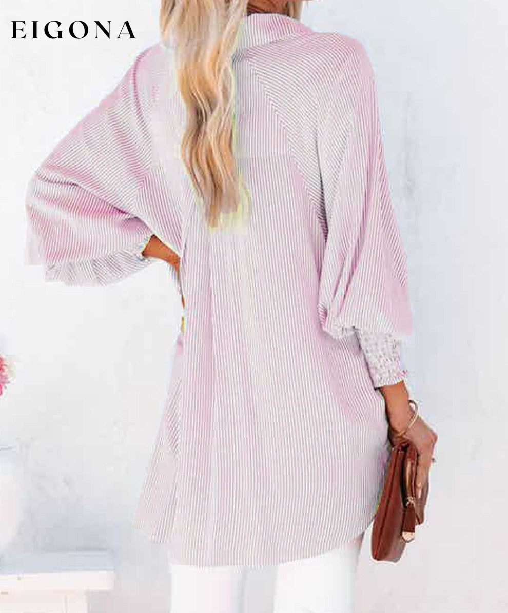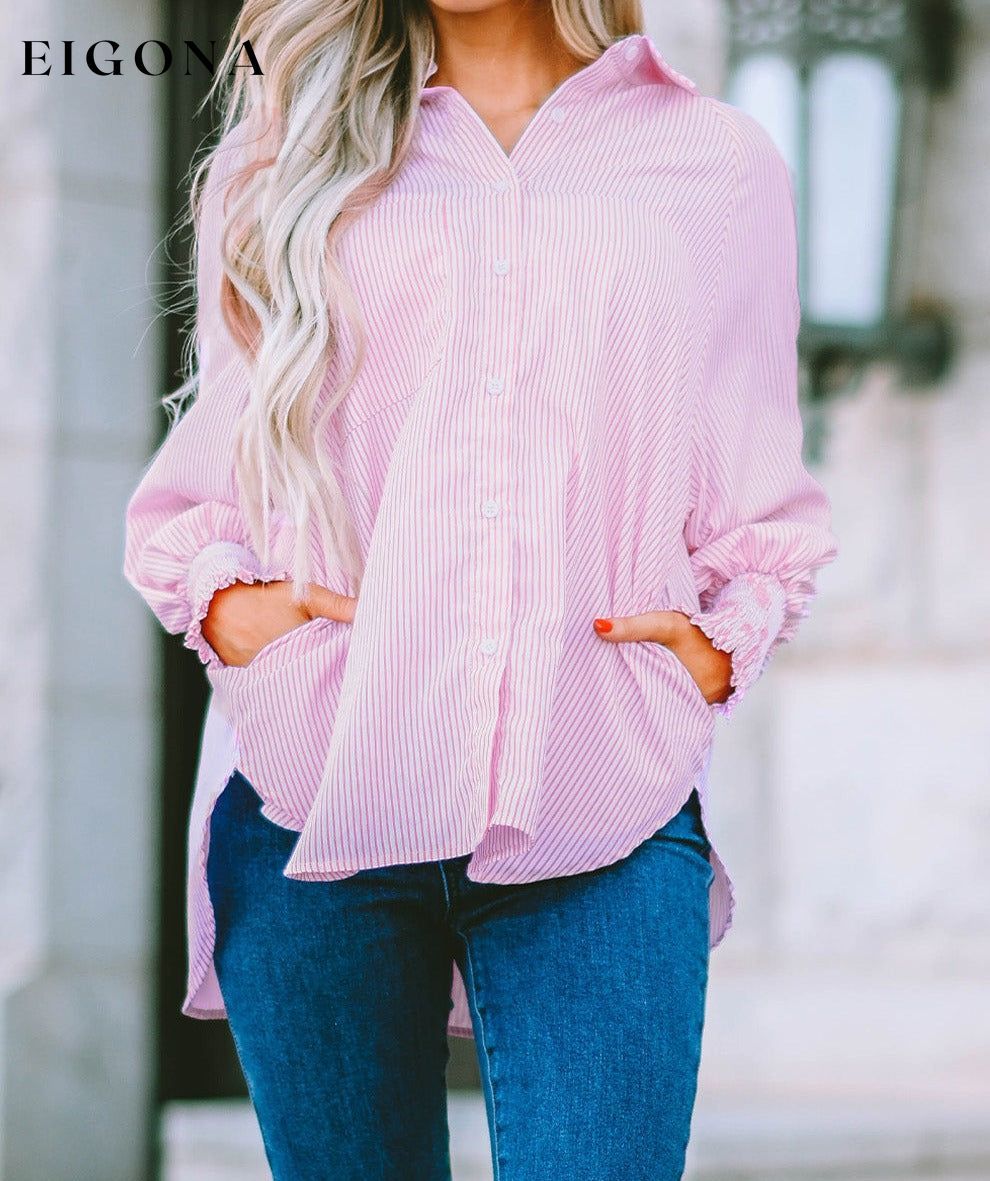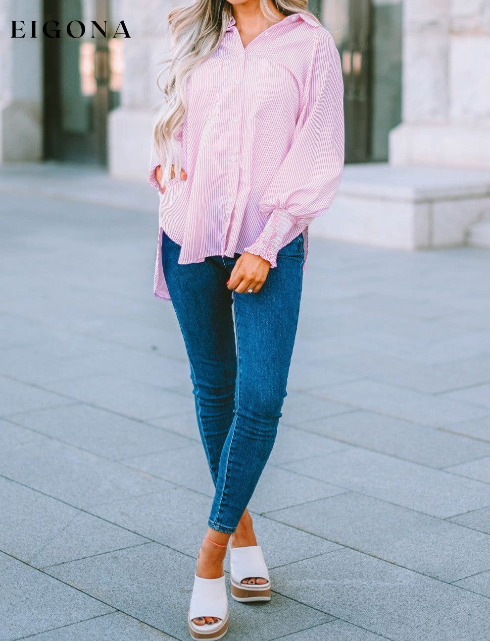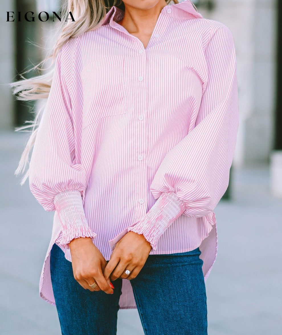Pink Smocked Cuffed Striped Boyfriend Shirt with Pocket