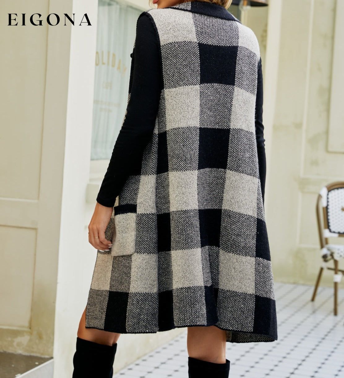 Plaid Lapel Collar Sleeveless Long Cardigan