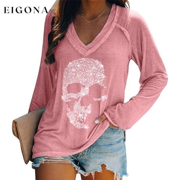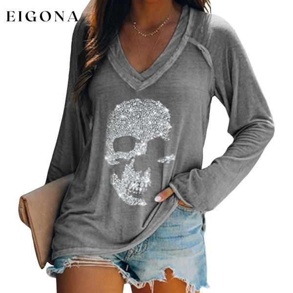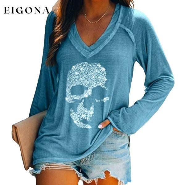 Women's Loose Skull Printed Long Sleeved V-neck Shirts Cotton Tops