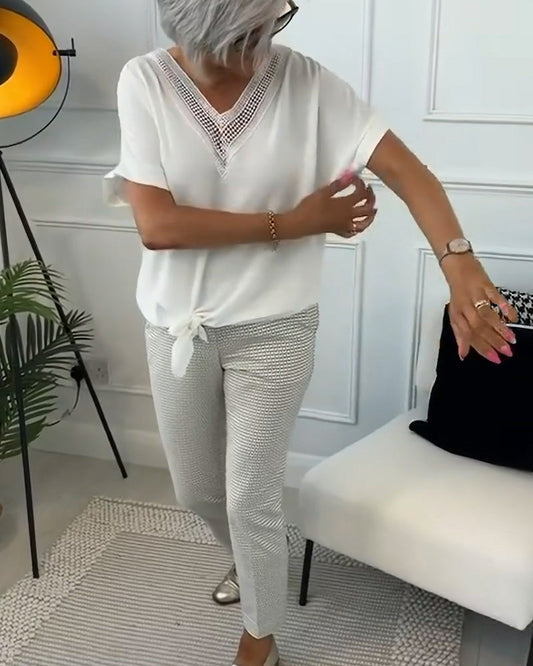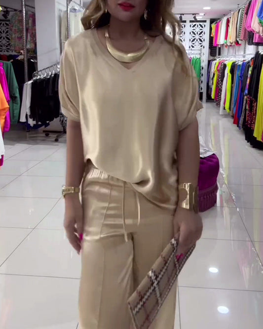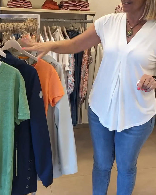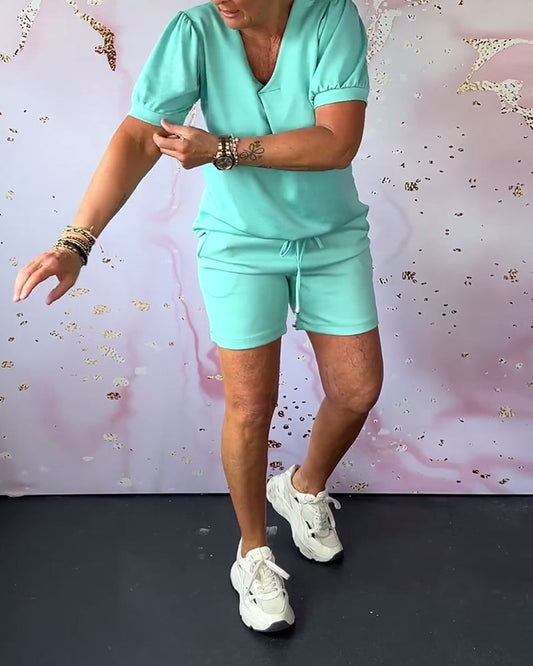 Blusa oca casual de cor sólida com decote em V e manga curta
