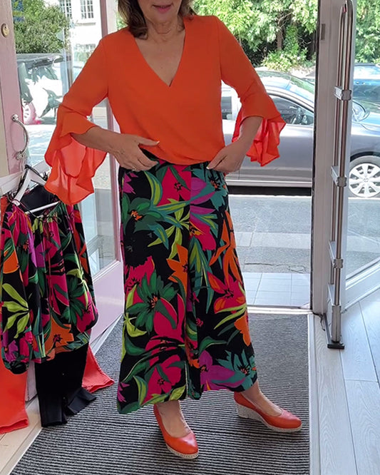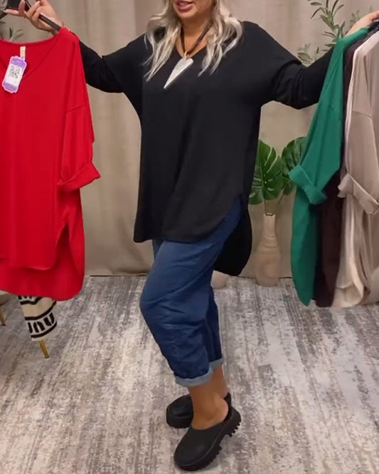 Blusa casual de cor sólida com decote em V e manga três quartos