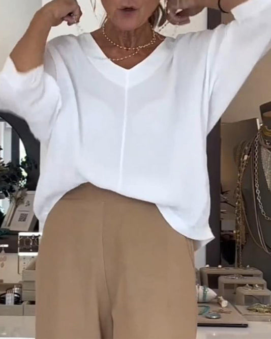 Blusa casual de patchwork com decote em V e manga três quartos de cor sólida