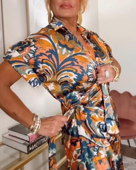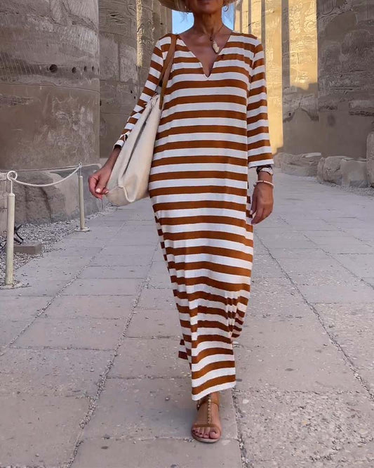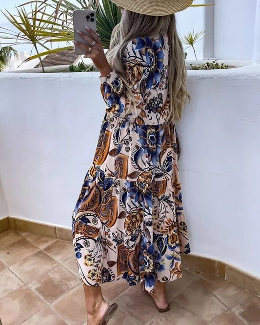 Vestido moderno com estampa floral com decote em V e manga comprida