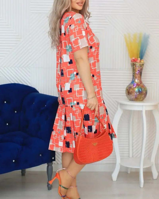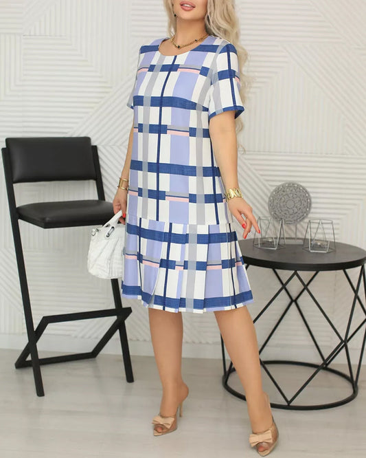 Vestido casual em patchwork com estampa xadrez e gola redonda