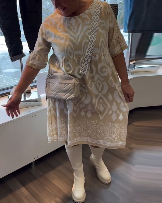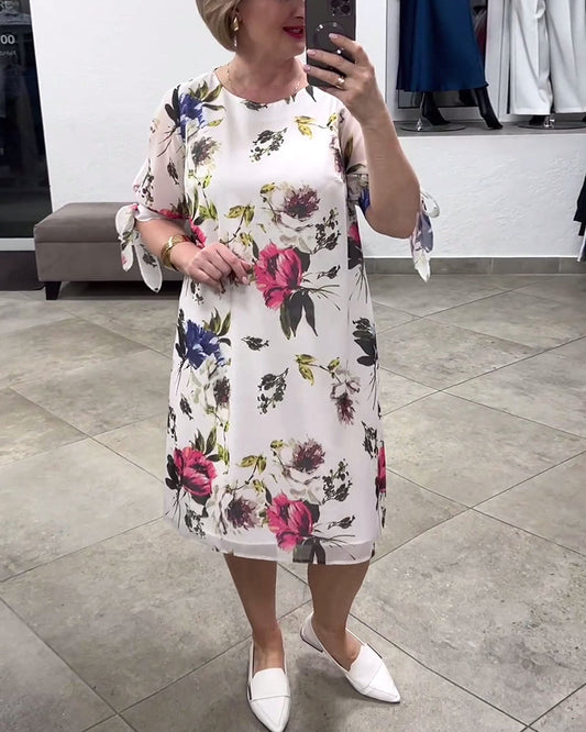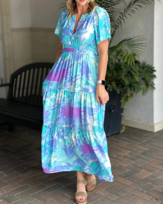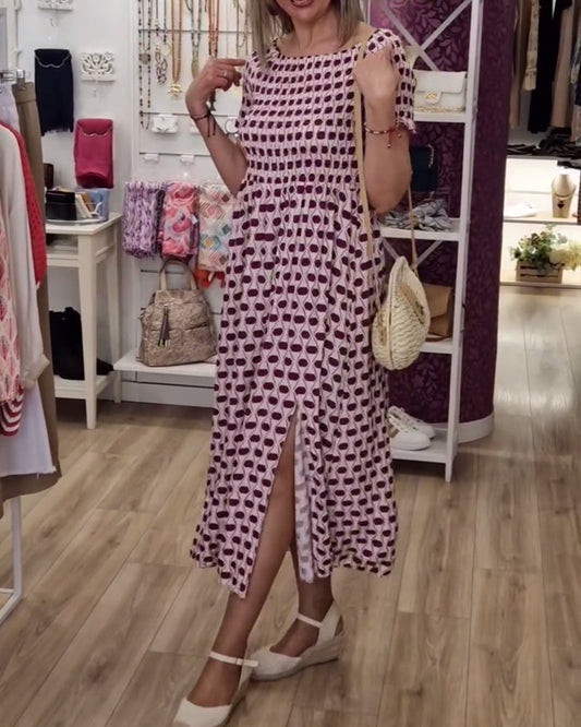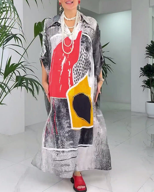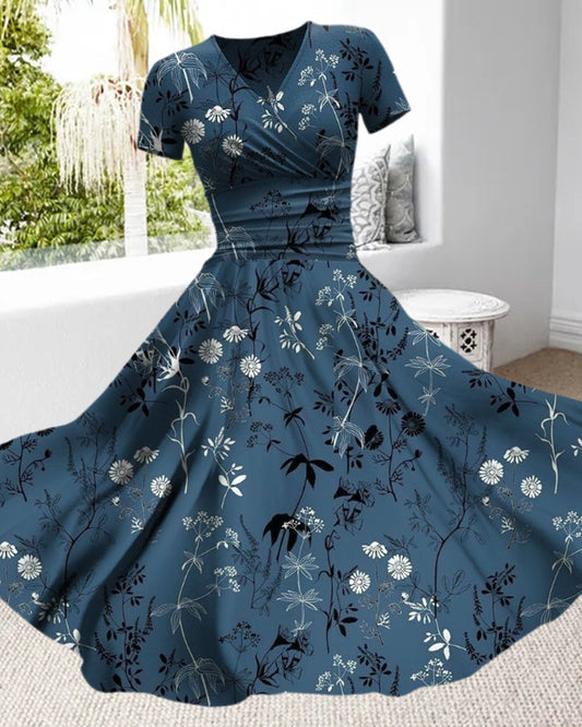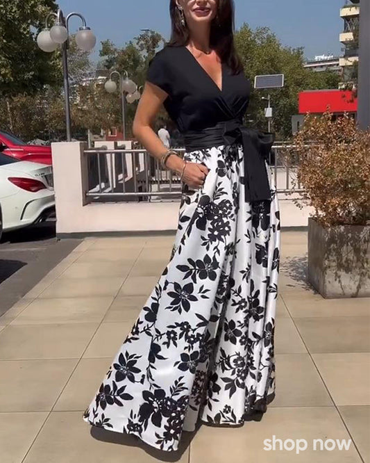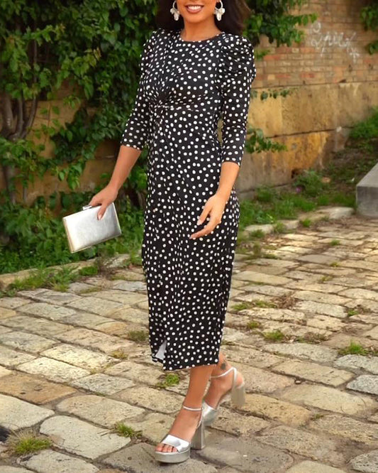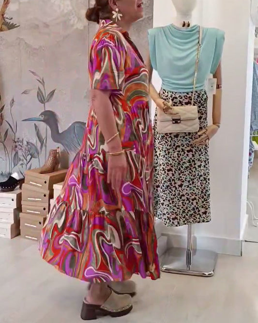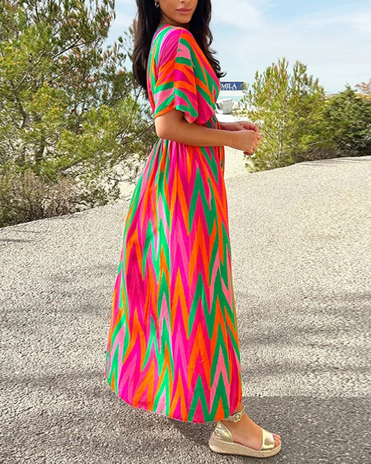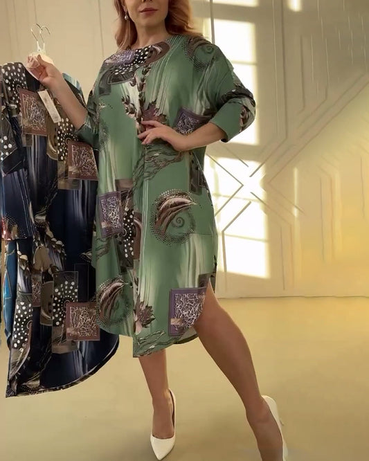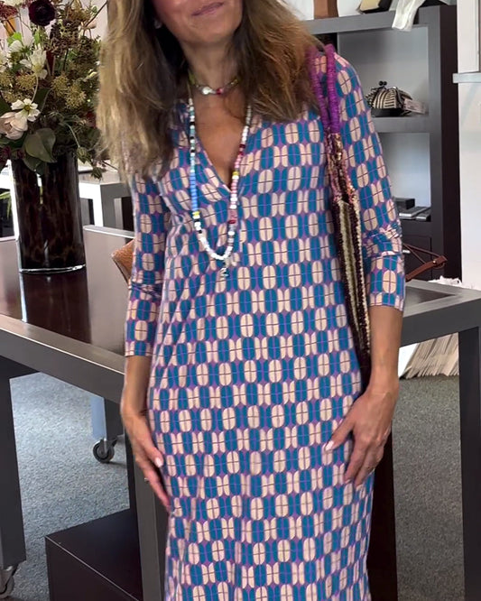 Vestido elegante estampado com fenda em V profundo e manga comprida