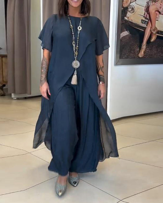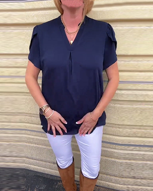 Lapel Pleated Solid Color Short Sleeve Shirt