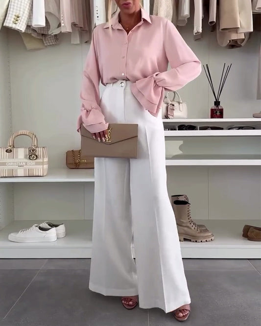 Lapel Button Bell Sleeve Solid Color Shirt