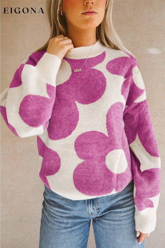 Suéter de ombro caído com padrão de flor grande rosa brilhante