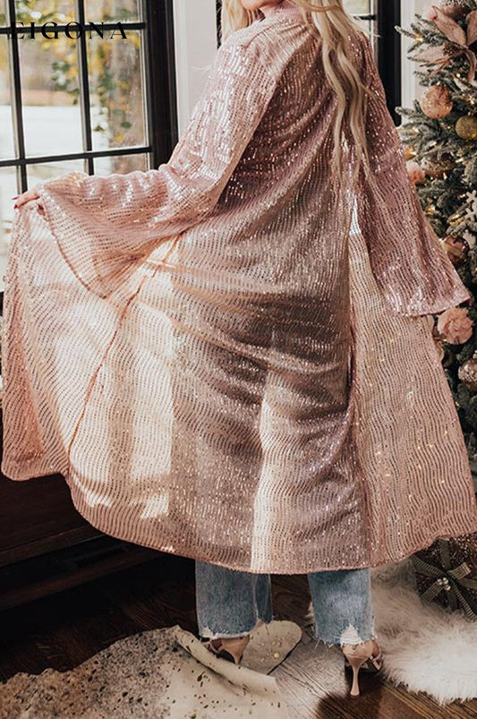 Cardigan de lantejoulas quimono longo com lantejoulas rosa tan aberto na frente